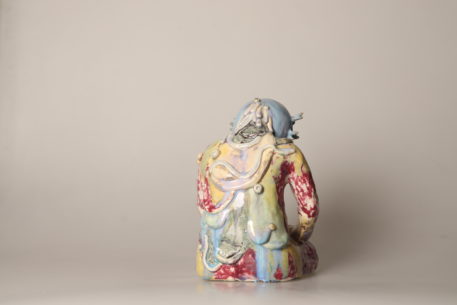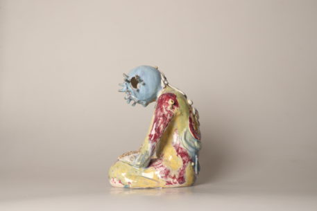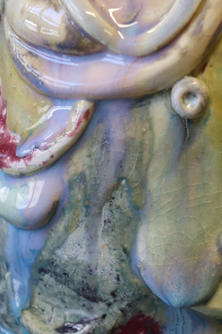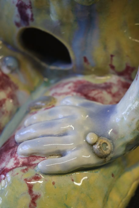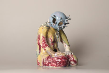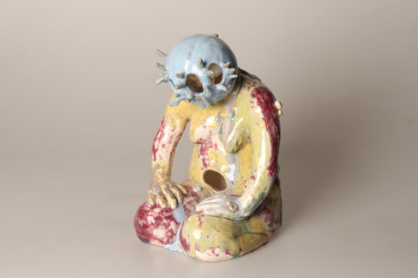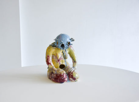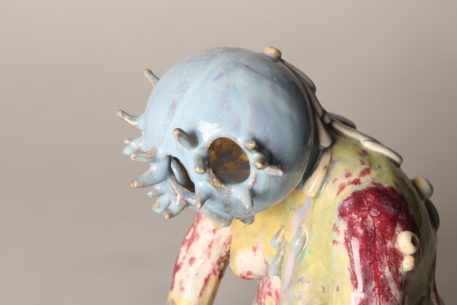Tous les étés, de plus en plus de méduses s’échouent sur les plages. Elles sont encore luisantes, et le soleil se reflète sur leur chapeau de gelée. De son côté, Bonhomme est resté un peu trop longtemps immobile. Il/elle a appris à respirer sous l’eau et des antennes lui ont poussé sur la tête. Ses organes se sont dissous à cause du sel des vagues. Il ne reste qu’une carapace. Des grains de sable sont collés sur son crâne vitrifié.