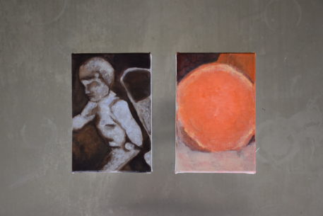 Eternal Burden est un diptyque représentant une petite figurine portant un panier. Sur la seconde toile se déploie une forme aux contours ambigus, pouvant évoquer une orange, un soleil ou encore une simple présence picturale — à la fois objet de sa récolte ou fruit tombé.