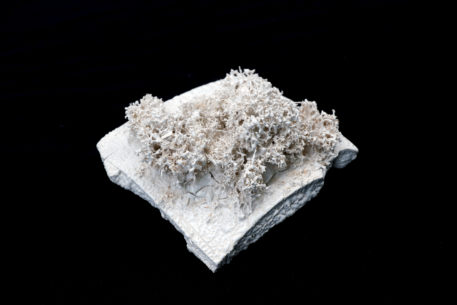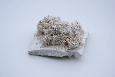 Série de céramiques, nourries de matières glanées autour de Nantes et vers Carnac : tuffeau pulvérisé — calcaire tendre issu de la lente sédimentation de coquillages microscopiques, vestige d’un océan disparu — mêlé à des racines, lianes et bois morts. Au four, l’organique se consume et laisse son empreinte : fossiles, ossements, cartographies cellulaires. Les formes obtenues évoquent les reliefs révélés à marée basse, quand l’eau se retire et montre l’envers du monde. À la manière de tessons antiques, ces pièces interrogent la frontière entre mémoire et imagination, fragilité et résistance au temps. Modestes archives du vivant, elles témoignent des cycles d’érosion, de disparition et de retour. Humblement, le projet fait sentir la circulation entre mémoire minérale, organisme et imaginaire, et invite à regarder ce qui demeure, suspendu entre effacement et permanence.