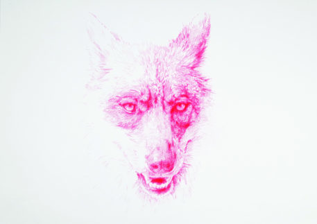 Le dessin au crayon de couleur représente une tête de loup.