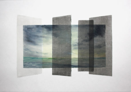 Le monotype est un procédé d’impression sans gravure qui produit un tirage unique. Au premier plan prennent place des écrans en perspective, récurrence emblématique de notre travail. Ces surfaces transparentes de textures vaporeuse, passent du gris au blanc laissant apparaître un paysage. Fenêtre, écran, percée, souvenir d’une image pensée, passante, éphémère.