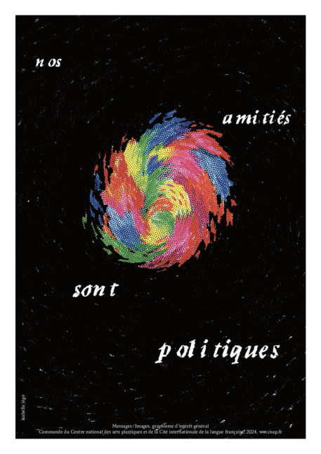 L’astre flamboyant, explosif, est accompagné par une composition typographique poétique. Sans majuscule ou ponctuation, un léger décalage entre certaines lettres donne à ce credo une portée musicale. Détachée d’un poids conventionnel ou de la vacuité d’un slogan, cette pensée continue de résonner en nous et avec elle des réflexions que l’on ne formule pas assez : on hérite d’amitiés, elles nous bouleversent et nous façonnent. Indomptables, des amitiés tissent des sororités et des fraternités joyeuses. À l’heure où les réseaux sociaux questionnent la profondeur ou le réel de nos amitiés, cette image porte l’attention sur la réalité « révolutionnaire » de l’amitié. Entre celles que nous activons et celles qui nous relient à notre passé, nos amitiés participent à forger notre émancipation intellectuelle. Elles consolident des collectifs.