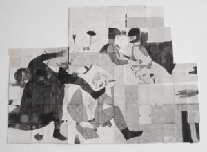 Dans cet ensemble de dessins des personnages qui font penser à des chevaliers s’entretuent et en même temps se touchent et se sentent. Mon souhait était de porter au regard l’intensité des émotions qui naissent lors d’une relation amoureuse. J’ai commencé à dessiner des chevaliers suite à une lecture de La Chanson de Roland, un poème épique du milieu du Moyen-Âge. Lecture impressionnante de par la violence guerrière décrite assez crûement et l’ambiguïté érotique perçue dans l’amour fraternel qui anime Roland et ses compagnons d’arme. Au fil du temps, le dessin s’est nourri d’influences picturales comme la miniature persane et les estampes érotiques japonaises ; ces dernières ont inspiré directement certaines caractéristiques corporelles des chevaliers, tels leurs sexes démesurés et leur pilosité délicate. À la façon des miniatures persanes, le moindre détail (un pétale de fleur, un sourcil, une goutte de sang, le pommeau d’une épée) est ici dessiné avec une intention particulière, comme si c’était la chose la plus importante. Les dessins sont exécutés à la plume avec des lavis d’encre de chine sur des fonds fabriqués en assemblant de petits carreaux de papier. À tout instant un dessin peut être découpé, divisé, et les parties ainsi obtenues être assemblées à d’autres fragments. C’est un jeu de montage dont le but est de trouver un équilibre, une tension ; c’est aussi une sorte de liberté, qui me paraît nécessaire aujourd’hui dans l’acte de création, que les choses puissent être toujours, jusqu’au dernier moment, autrement.